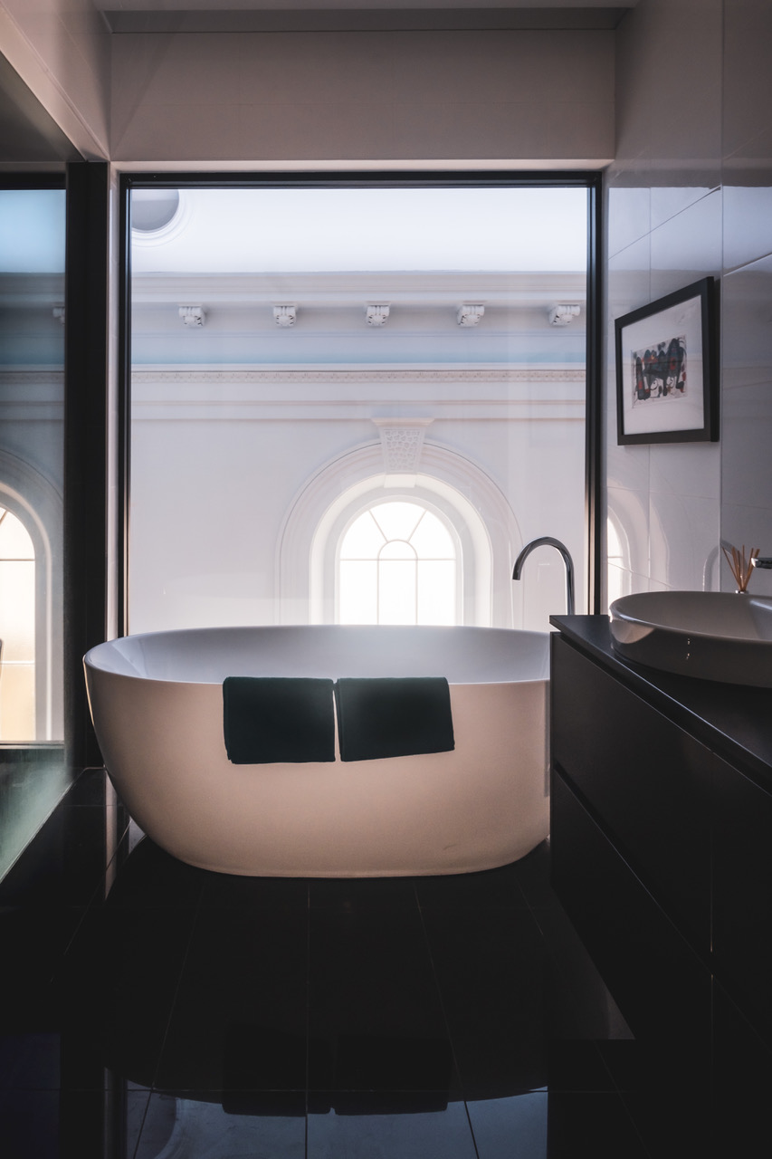 The luxury accommodation at Battista is a home with some serious soul. It’s dreamy, soft, and a safe space to cocoon. Natural light leads the way, and the huge windows and vaulted ceilings are breathtaking. Glass walls give an uninterrupted view of the fabric of the old building.
